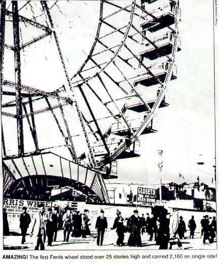 Ferris Wheel Was Our Answer to Eiffel Tower By Sam Ewing Did you ever wonder how the "Ferris wheel" got its name? Or wonder how this still-favorite old ride came about? Then read on! In 1893, despite a nationwide economic depression, the Worlds Fair was scheduled to open in Chicago. With business sagging like the seal of a clown's baggy pants. the sponsors of this "World's Colombian Exposition)" were desperate for a super attraction. Four years earlier; the Eiffel Tower had astounded the world at the Paris Exposition. hungry for a headline-making wonder of their own, promoters of the upcoming Chicago fair challenged the civil engineers of America to design something that would captivate the public. That challenge fired the imagination of a talented young engineer named George Washington Gale Ferris. Ferris conceived the farfetched idea of constructing a gigantic, power-driven wheel that would lift hundreds of people into the air simultaneously. ''I'll build a wheel so big it will put the whole world in a spin!'' He reported to have claimed. It took a white for the confident mechanical engineer in his mid-20s from Galesburg, Illinois to sell his idea to the exposition's sponsors. Some thought this is who described a ''spinning wheel with rocking chairs attached'' was slight off his own rocker. The exposition sponsors finally gave Ferris the go-ahead, it was a decision they would never regret. When Ferris put the mammoth wheel on the midway, it stopped the show. Chicagoans and visitors alike gaped in amazement at the spectacular mammoth ride. And well they should have. What a Wheel It Was The first Ferris wheel was the grand-daddy of them all. Weighing in at an incredible 1.200 tons. it was supported by huge towers reaching 140 ft. into the sky. It was 250 ft. in diameter. 825 ft. in circumference and 30 ft. wide. There were 36 passenger cabs, each capable of seating 60 thrill-seekers.. That meant as many as 2,160 people could take to the air on a single ride! Ferris' big wheel soon proved to he the sensation of the exposition--long lines of eager fair-goers waited hours for a chance to climb aboard. Just as the farsighted inventor had predicted. news of his entertainment miracle set the whole world talking. Even the French had In admit the attraction made more of a splash than their vaunted tower. Biggest Ever Built Though Ferris wheels have been spinning at carnival and amusement parks ever since, there never has been a bigger wheel than the one George Ferris built nearly 100 years ago. The mammoth wheel was used again at the l904 Louisiana Purchase Exposition. The ride saw little use after that, and was eventually disassembled and sold for scrap metal. Published in Reminisce Magazine March 1992 |